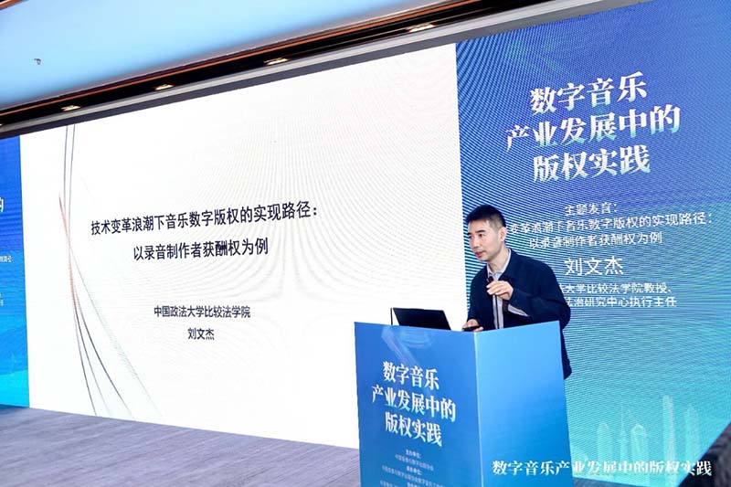 中国政法大学比较法学院教授、文化娱乐法治研究中心执行主任刘文杰,以"技术变革浪潮下音乐数字版权的实现路径" 为主题,聚焦录音制作者获酬权展开阐述。他指出,我国现行《著作权法》第45条赋予录音制作者以获酬权,该规定一方面为录音制作者赋予新的权利,有助于保护其利益,另一方面,该规定实质上属于法定许可制度,也就是使用者在使用前无需取得权利人许可,只需支付报酬即可。由于法律规定排除了权利人的磋商机会或谈判机会,因此需要确立一个公平科学的报酬标准制订机制,从而明确使用音乐录音制品的报酬标准。