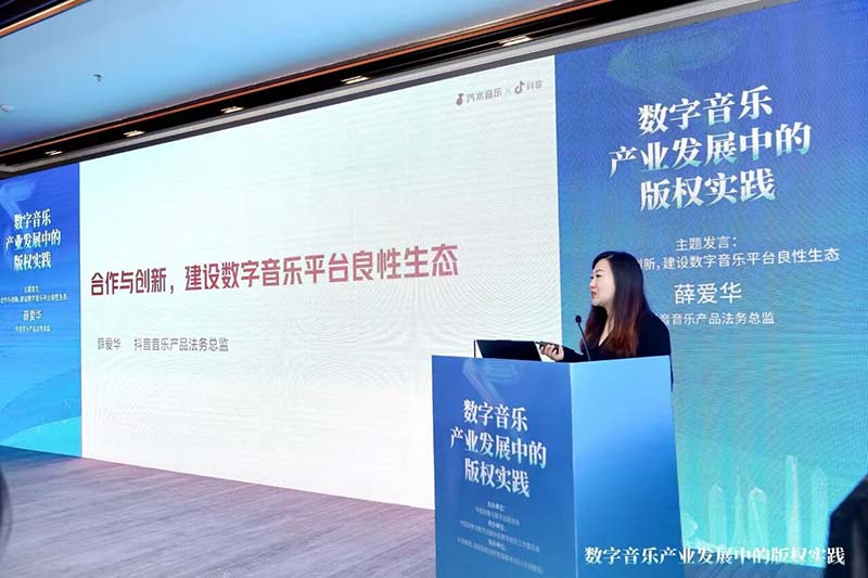 抖音音乐产品法务总监薛爱华,分享新业态音乐版权实践,她指出,抖音努力践行让平台更好地连接音乐用户与行业,持续推动优质内容的创作、运用和传播,如推出了「抖音&汽水音乐看见音乐计划」,积极探索AIGC辅助音乐创作,汽水音乐节线下消费助力新人新歌出圈。